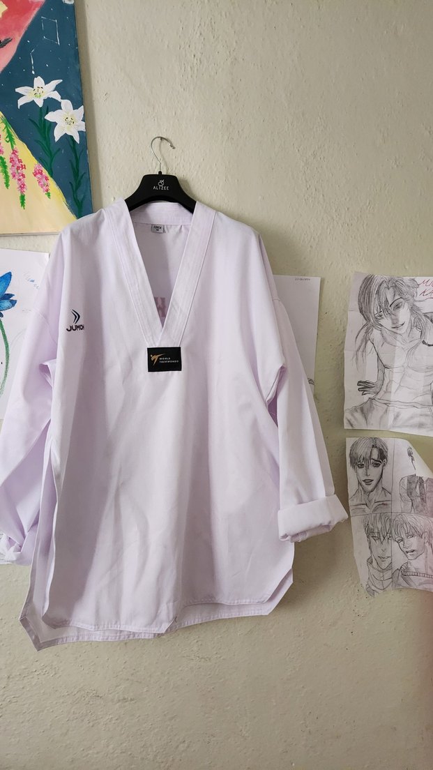 Tekvando kimonosu DOBOK üst, iki kol arası 68 cm, uzunluk 86 cm, kol 60 cm. 190 lik beden, sadece 1 kere giyildi kusuru yok