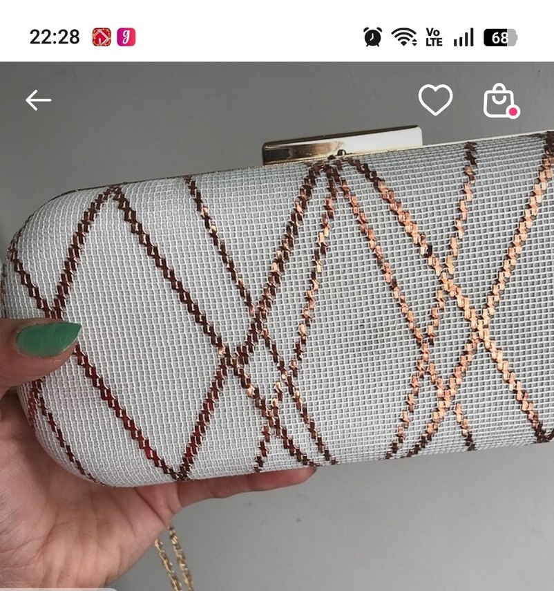 Sentetik kumaştan yapılmış, boncuk işlemeli yılan desenli beyaz portföy çanta. Düğün gibi gösterişli etkinlikler için uygundur. Zincir askılı, çağdaş tasarım.