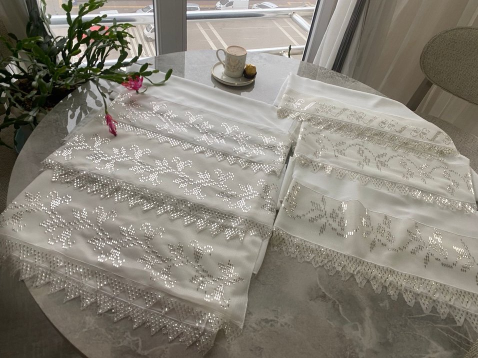 Beyaz tel kırma eşarp, işlemeli çiçek desenleri ve parlak yüzeyiyle klasik bir görünüm sunar. Hazır olma süresi 7 gündür