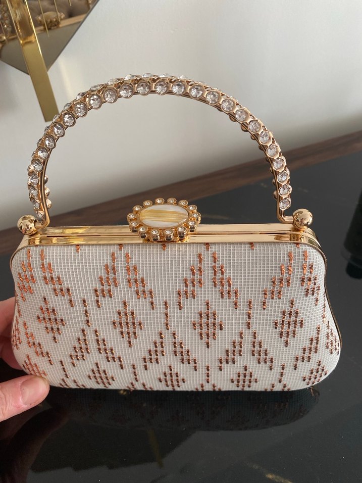 Telkırma işlemeli sap ve çerçeveye sahip beyaz, sentetik kumaş kadın portföy çanta, düğünler için uygun. ✨