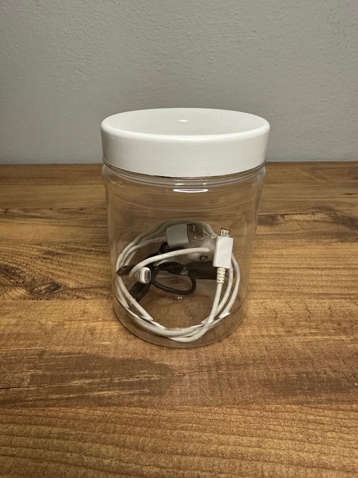 Beyaz kapaklı şeffaf kavanoz içinde beyaz telefon şarj kabloları, düzenli ve korunaklı saklama sağlar.