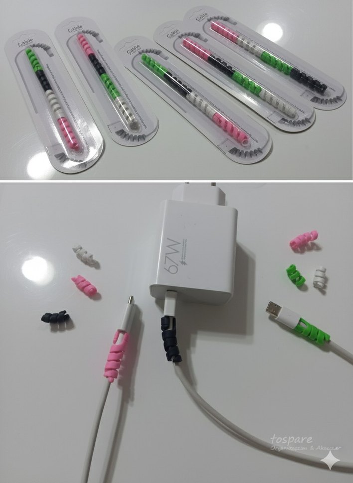 Telefon şarj kablosunun kırılmasını önleyen, çeşitli renklerde kolay takılan koruyucu seti. 1 pakette toplam 4 adet bulunmaktadır.