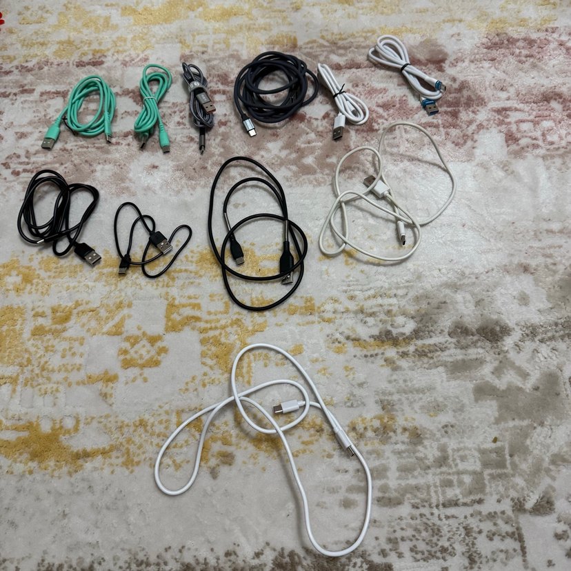 Farklı cihazlara uygun gri, beyaz, siyah ve yeşil renklerde çeşitli telefon şarj kabloları seti. Type-C