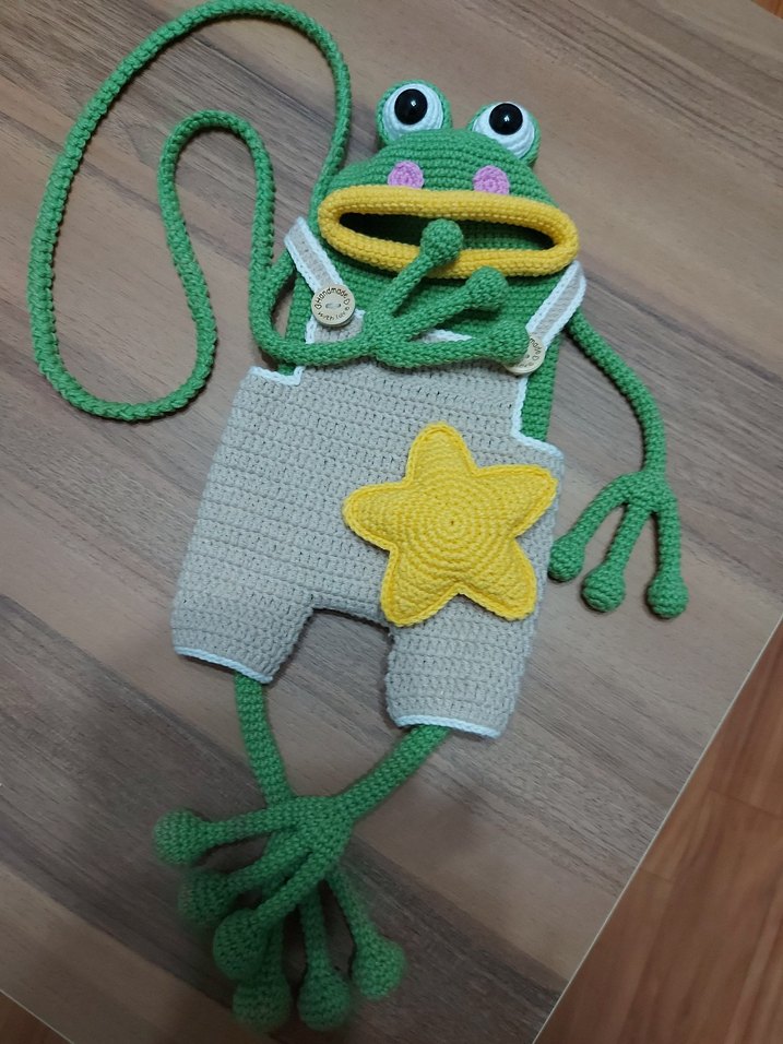 Alize koton iple örüldü ,kurbağa figürlü, yumuşak dokulu bej renk kurbağa çantası , uzun askılı ve yıldız detaylıdır.