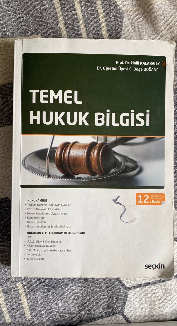 Prof. Dr. Halil Kalabalık imzalı Temel Hukuk Bilgisi kitabı, temel hukuk kavramları, kamu düzeni kuralları ve hukuk kurumlarını içerir. 12. baskı, Seçkin yayınevi. ⚖️