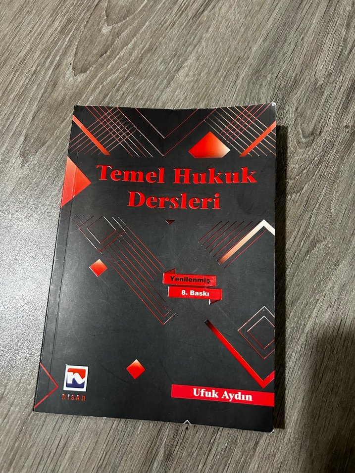 Ufuk Aydın tarafından yazılmış, yenilenmiş 8. baskı Temel Hukuk Dersleri kitabı, temel hukuk prensiplerini içerir. 4-5 sayfada fosforlu kalem çiziği vardır.