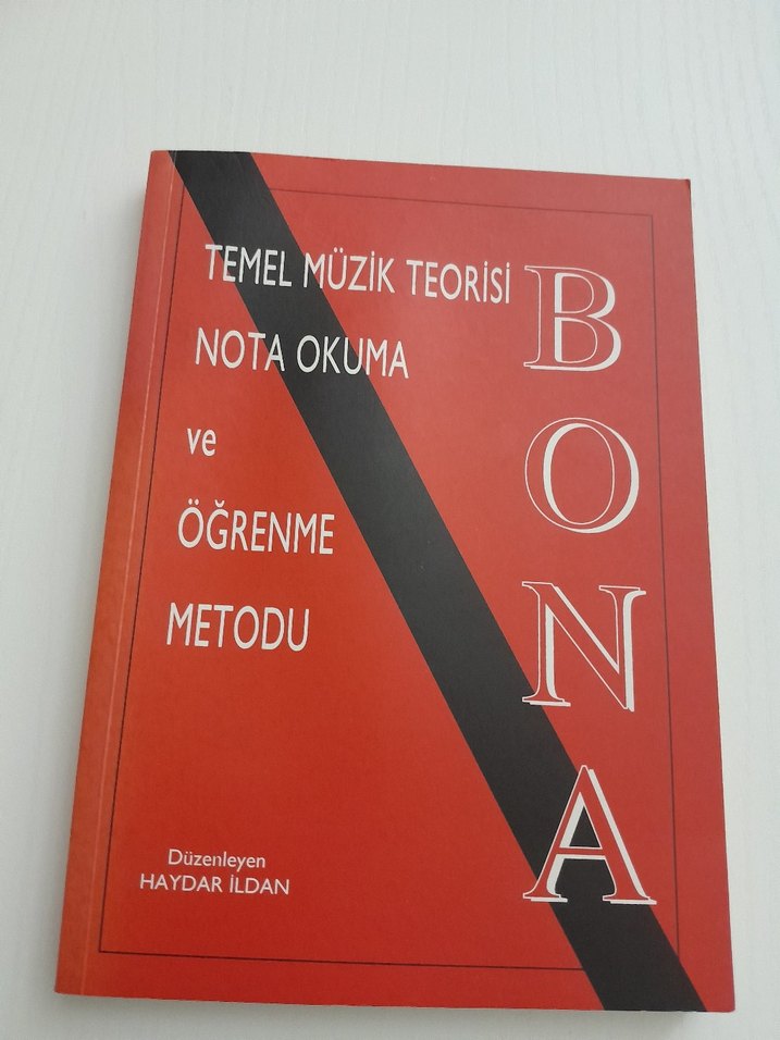 Haydar İldan tarafından düzenlenen temel müzik teorisi, nota okuma ve öğrenme metodu içeren kırmızı kapaklı kitap.