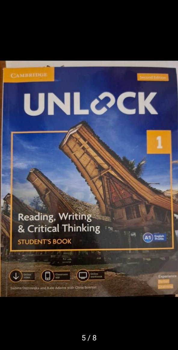 Cambridge University Press tarafından yayımlanan a1(temel ) seviye öğrenme kitabı. Okuma, yazma ve eleştirel düşünme becerisini güçlendirmeyi amaçlar. Fotoğraflara koyduğum gibi ara ara ufak notlar var. İlk sayfada olan kod sayesinde Cambridge'in çevrimiçi kaynaklarına ulaşabilirsiniz. Yırtığı veya eksik sayfası yok. Yeni öğrenmeye başlayan yetişkinler ve gençlere yönelik bir kitap.