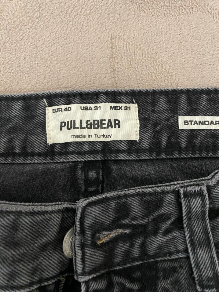 Gri bol kesim denim jean, tokalı detaylı ve baskılı desenli, Pull&Bear marka, midi boy, günlük kullanıma uygun.