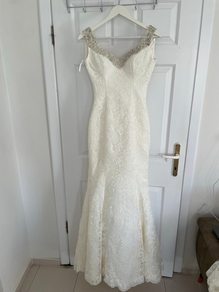 Özel dikim gelinlik. Çok iyi durumda, bir kere giyilip temizletildi. Duvak, çiçek ve takı kesesiyle birlikte satıyorum. Eteğinde kasnak yok ama kullanılan tüller hafif kabarıklığı sağlıyor eteklerde.