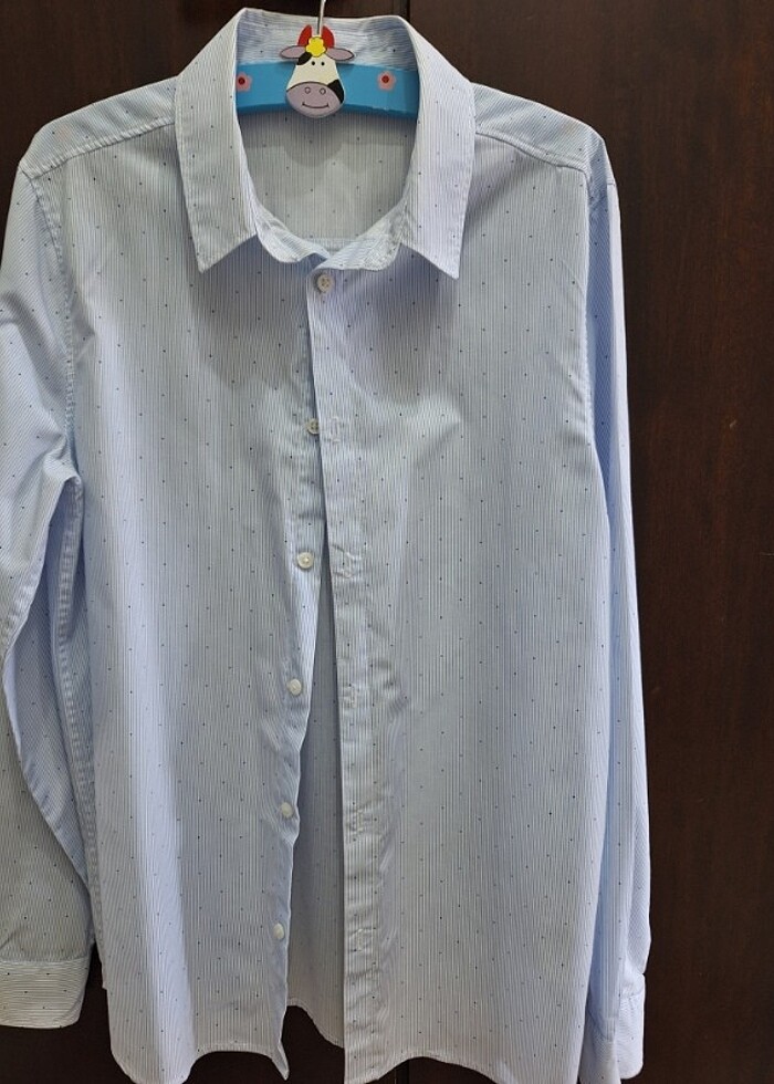 Gömlek hiç giyilmemiştir. H&M markalı olup hiçbir yerinde yırtık sökük lekesi kesinlikle yoktur. Çok yenidir. Zemin olarak çok açık mavi üzerinde çok ince çizgili