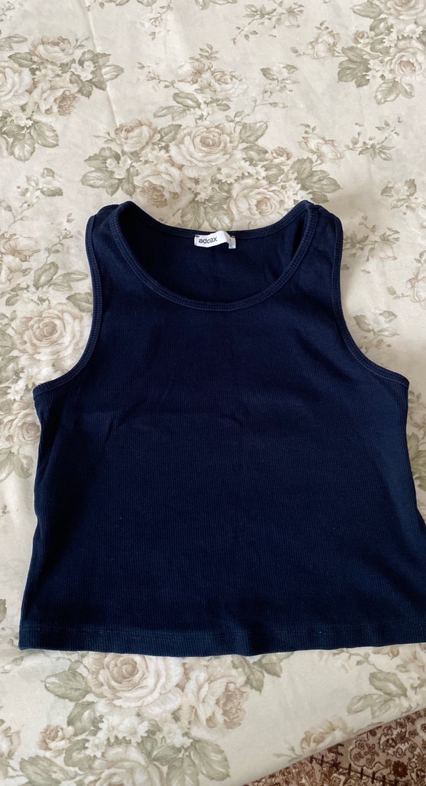 Pamuklu, dar kesim, kolsuz kadın atlet, askısız yaka ve koyu mavi renkte. Minimalist tasarımı günlük kullanım için uygundur.