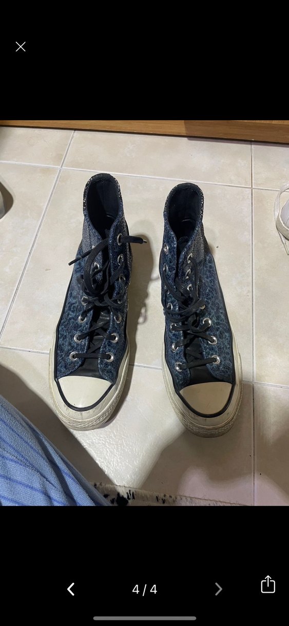 Yılan desenli kot malzemeden, bağcıklı ve dolgu topuklu kadın spor ayakkabısı. Mavi-gri tonlarında, günlük ve sokak stiline uygun.