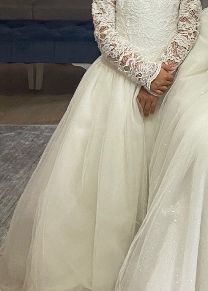 Ürün temizdir kuru temizlemesi yeni yapıldı tarla tanı yoktur kendisi hafif kabarık duruyor zaten hiçbir sorunu yok sadece boyu uzun geldiği için etek ucunda ufak bir yırtılma var ucu güpürlüdür isterseniz orayı kestirip güpürü tekrar diktirebilirsiniz ya da elinizle de dikebilirsiniz bir daha kullanmayacağım için satıyorum boyu 104 cm