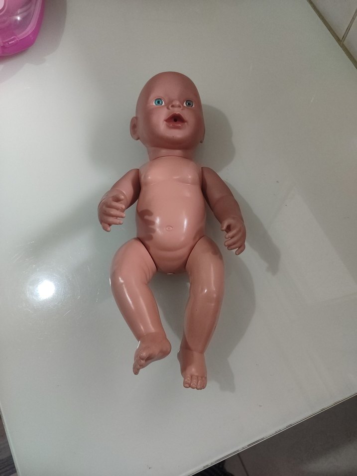 Pastel ten renginde, hareketli kolları ve bacakları olan, mavi gözlü gerçekçi bebek oyuncak.