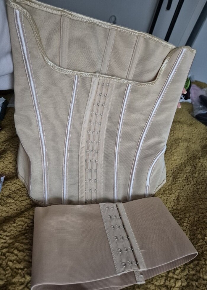 nefes alabilir kumasi var ama sıkı tutar. bez gibi yumusak kendini salan degil tok tutan inceltici bir yapisi var. esneklik payi vardir. korsenin ustune ek olarak sıkan bir parcasi daha vardir gorselde gordugunuz gibi