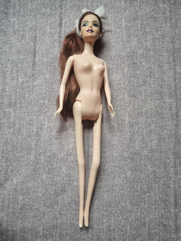 Uzun kahverengi saçlı, saç bandı takan, ince yapılı ten rengi pastel oyuncak bebek.