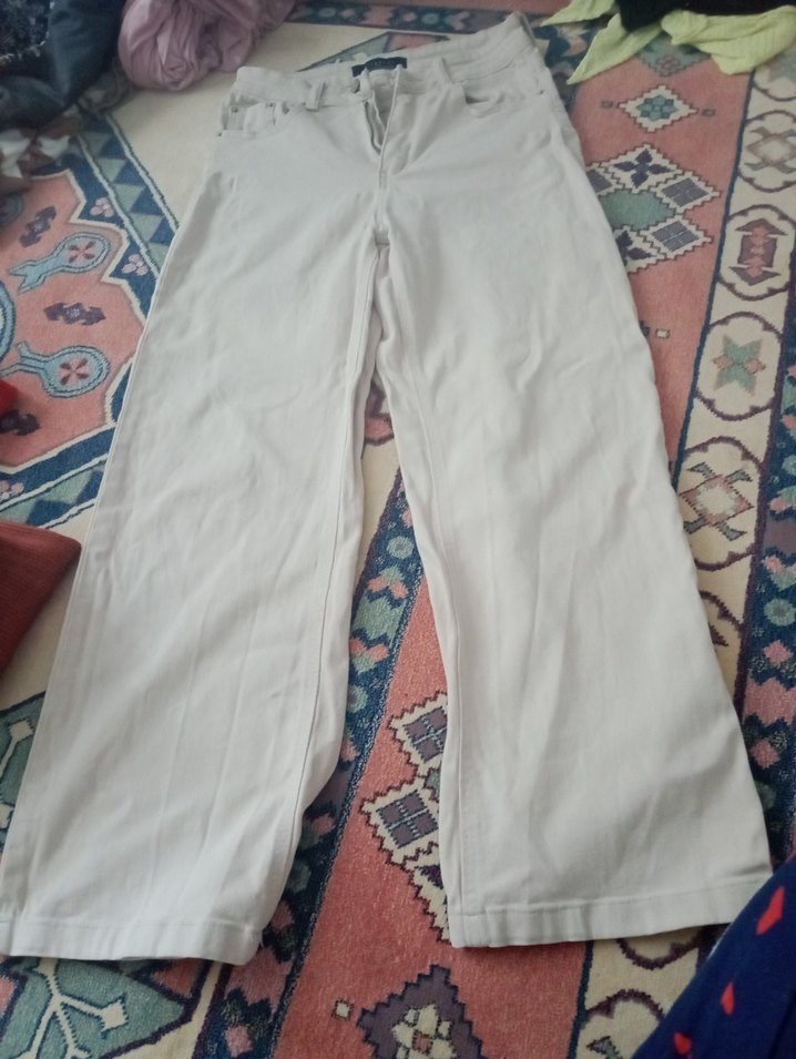 ten rengi pamuklu kumaştan, salaş kesim ve midi boyda, kemerli kadın pantolonu. Günlük rahat sokak stili için uygundur.