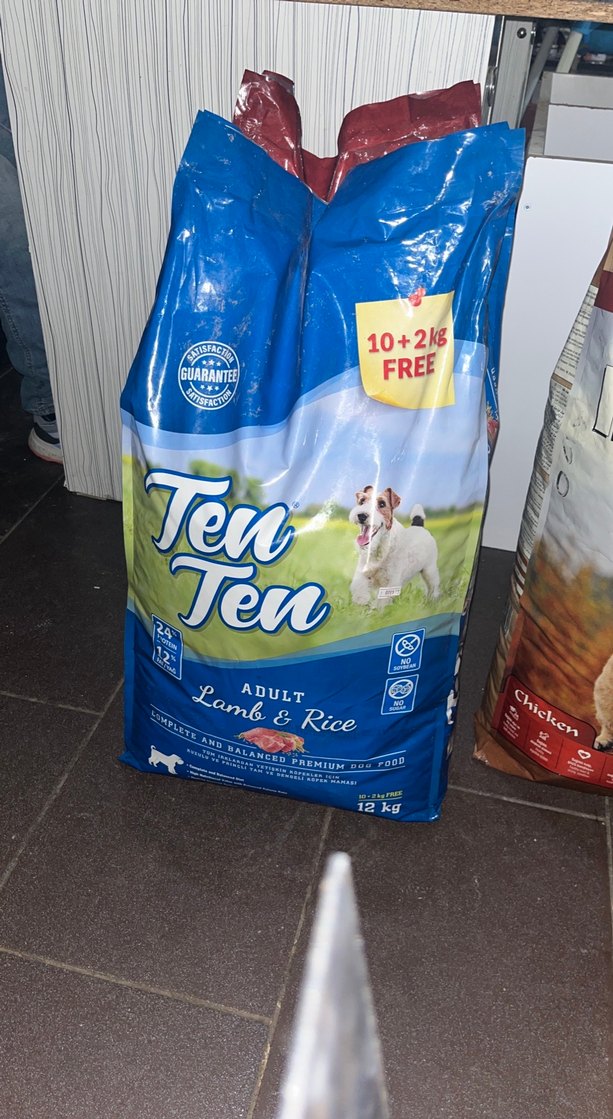 Ten Ten yetişkin köpekler için kuzu etli ve pirinçli dengeli mama. 10+2 kg ücretsiz, toplam 12 kg ağırlığında paket.