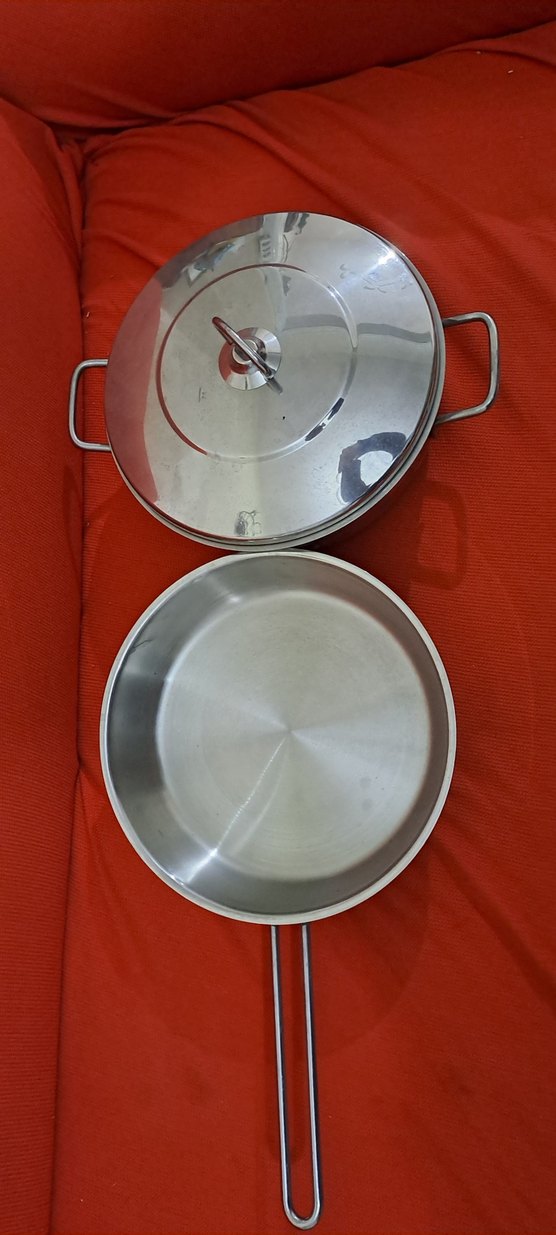 Kırmızı tabanlı, paslanmaz çelikten yapılmış tencere ve uyumlu kapağı. Tencerenin iki yanda tutma sapı, kapağın ortasında kaldırma sapı bulunur. sifir urun caplari 25,30 cm tava ic derinlik 6 tencere ic derinlik 8 celik