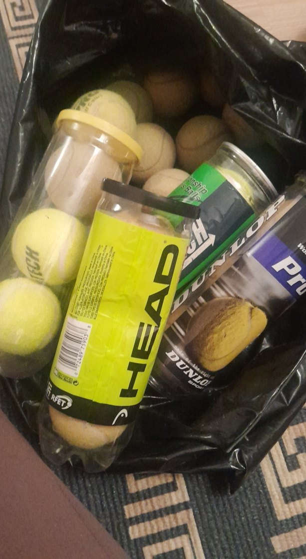 HEAD ve Dunlop markalı tenis topları ve kutuda tenis topları içeren çeşitli tenis topu paketi.