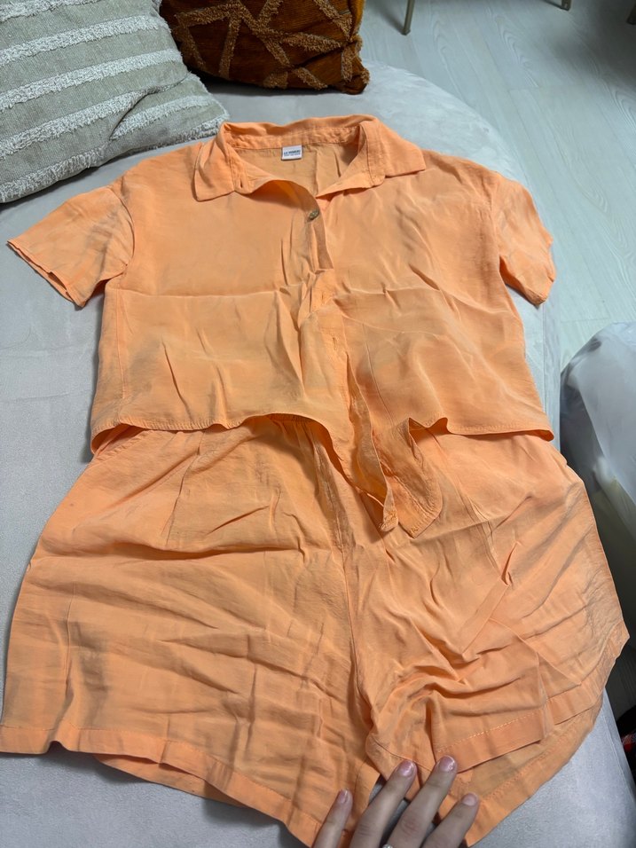 Turuncu tensel , kısa kollu, yakalı ve düğmeli gömlek, ve cepli şort rahat ve gündelik normcore tarzda. 12-13 yaş