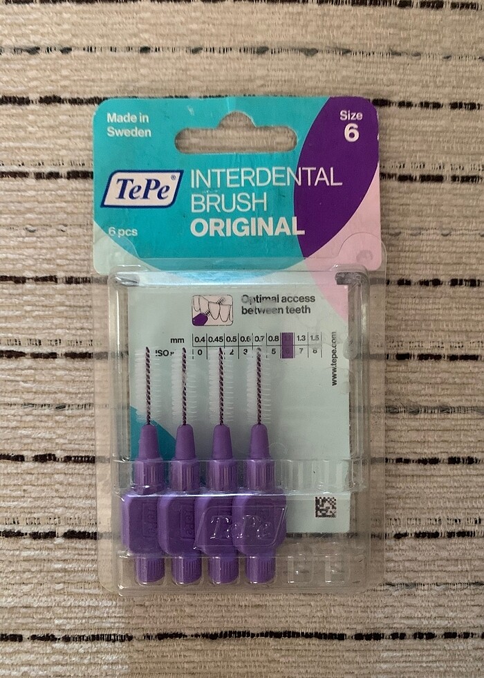 Tepe marka arayüz diş arası fırçasıdır. Mor, 1,1 mm, size 6 olup 6’lı paketten 2 tanesi kullanılmıştır. 4 tanesi paketiyle birlikte gönderilecektir.