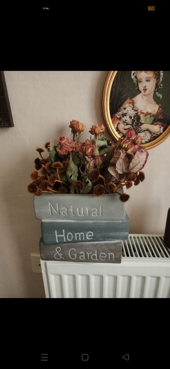 "Natural, Home & Garden" yazılı gri, üst üste dizilmiş kitap şeklinde dekoratif vazo. İçindeki kuru çiçekler gönderilmeyecektir. Tepe Home ürünü.