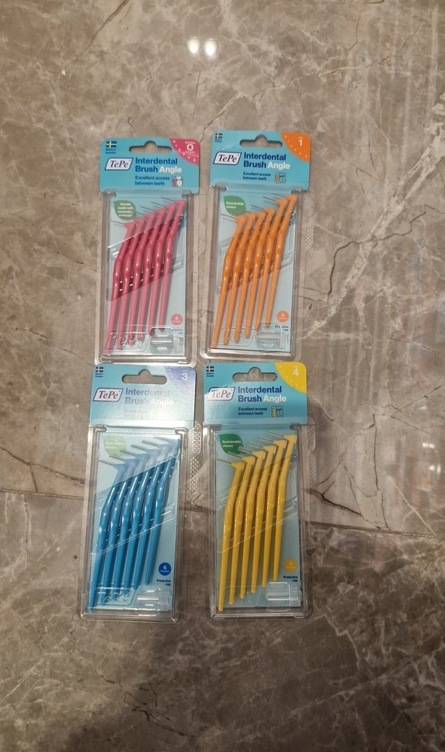 TePe pastel renklerde elastik kıllı arayüz fırçaları, diş aralarını temizlemek için. Her pakette farklı boylar bulunur.