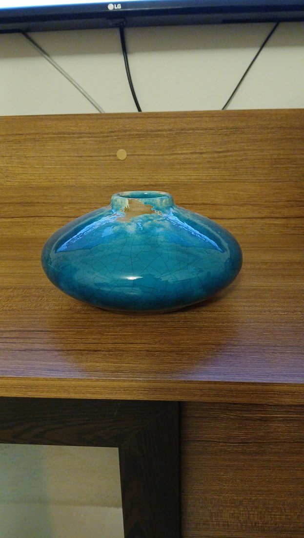 Parlak yüzeye sahip, yuvarlak ve yassı şekilli turkuaz vazo. Üst kısmında küçük açıklık ve hafif dokulu yüzey bulunur.