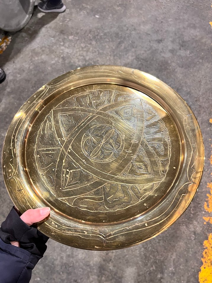 Parlak altın renginde, üzeri desenli tepsi. Sofranıza şıklık katar. ✨