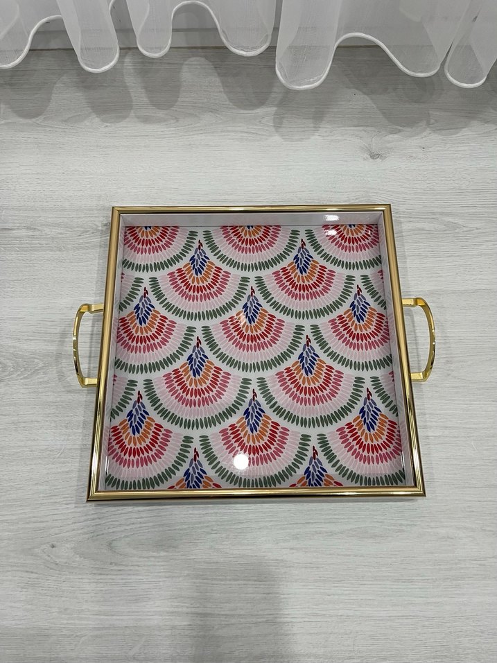 Metal kulplu kare tepsi, üzerinde renkli geometrik desenler bulunur. Hafif ve canlı tasarımıyla mutfakta şık bir sunum sağlar. Hiç kullanılmadı kutusu ile gönderilecek.