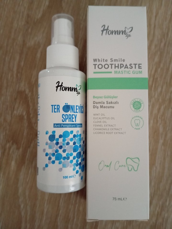 Deneme fiyatına veriyorum... Benim de kullandığım favori ürünlerden. Ter önleyici sprey ve damla sakızlı diş macunu seti. Diş macunu nane, okaliptus, karanfil, rezene, papatya ve meyan kökü özleri içerir. Terlemeyi azaltmaya yardımcıdır. #kozmetik #dişmacunu #sprey