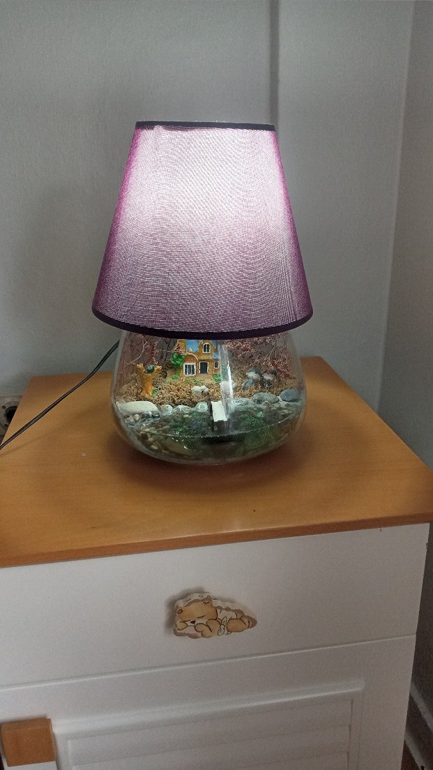 Mor renkli ince abajur başlığı ve cam tabanda küçük bir dekoratif teraryum sahnesi bulunan lamba. Yumuşak ışık ve doğal minyatür dekor birleşimi.