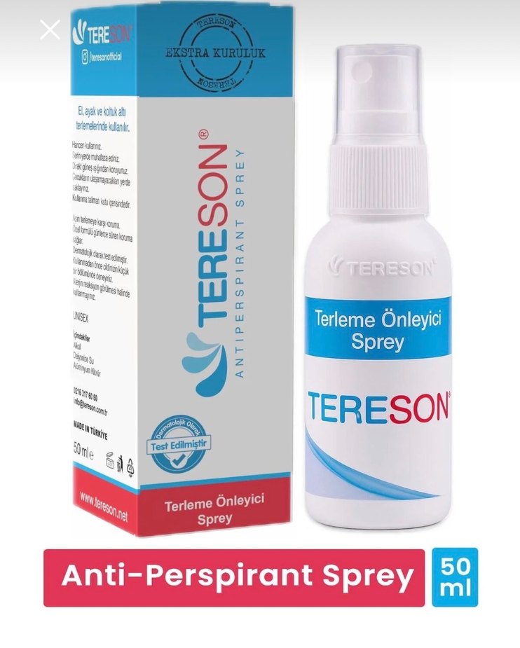 Tereson terleme önleyici sprey ekstra kuruluk sağlar ve terlemeyi önler. 50 ml sprey şişede kolay kullanım sunar.