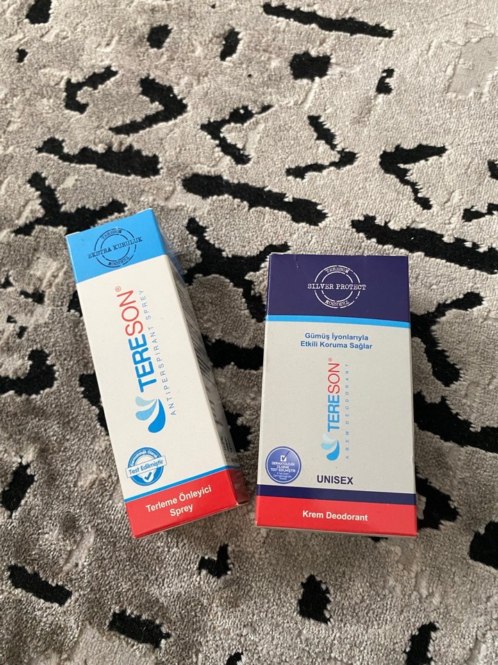 Tereson unisex krem deodorant, gümüş iyonlarıyla etkili koruma sağlar. Terlemeyi önleyen sprey de içerir. Denedim sadece