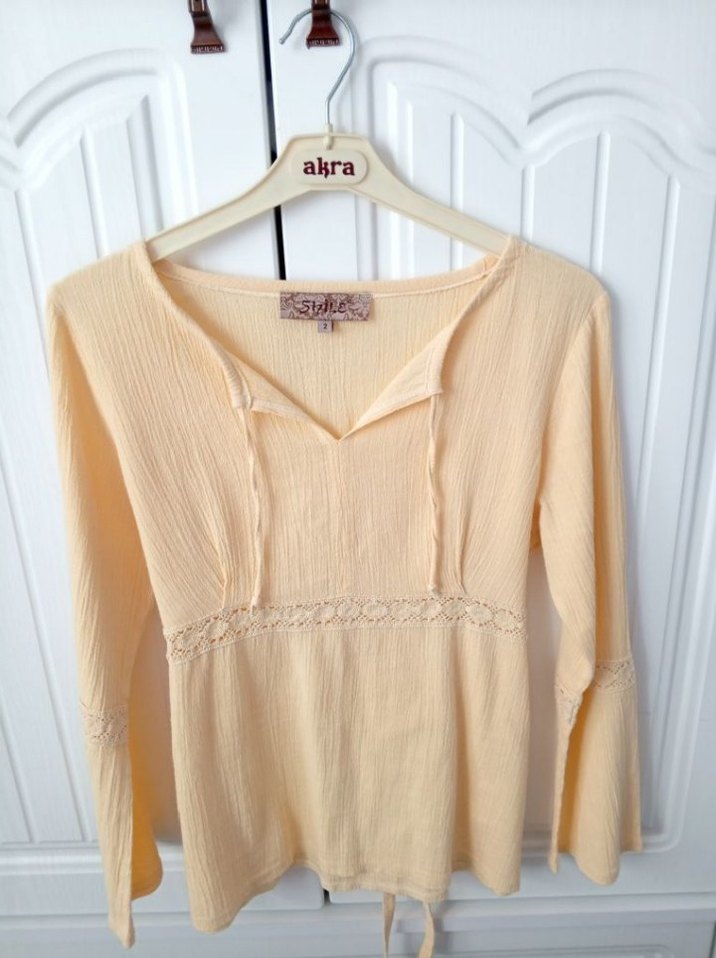 Tereyağı Sarısı şile bezi, uzun kollu ve V yakalı bluz. Oya detaylarıyla vintage bohem tarzını yansıtır. Günlük kullanım için uygundur. İzmir'den alındı.