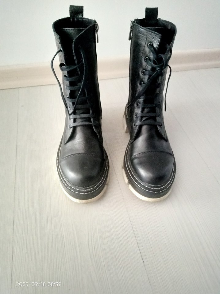 Siyah hakiki deri, topu topu 3 yada 4 kez giydim.Sadece alt tabanı biraz kirlendi,onun dışında taptaze sorunsuz tam kalıp