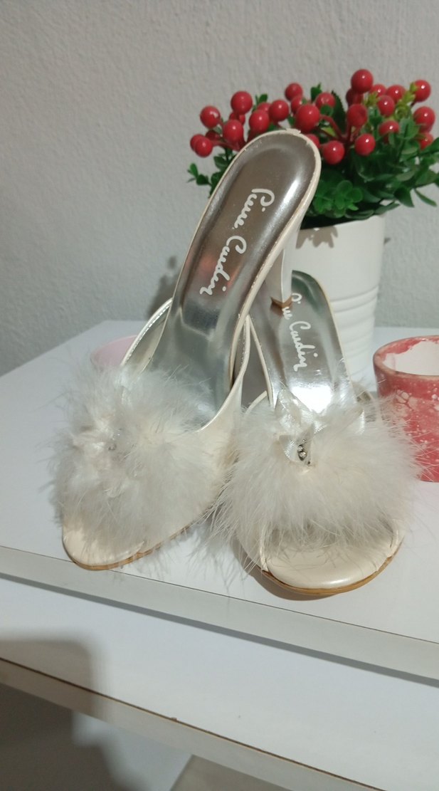 beyaz önü tüylü broşlu Pierre Cardin 37 numara terlik beyaz