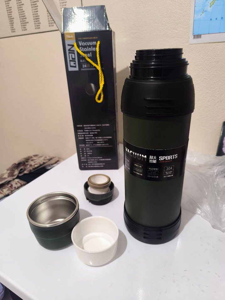 koyu haki renkli vakumlu paslanmaz çelik termos, içecekleri saatlerce sıcak veya soğuk tutar. Güvenli kapak ve dayanıklı tasarıma sahiptir.