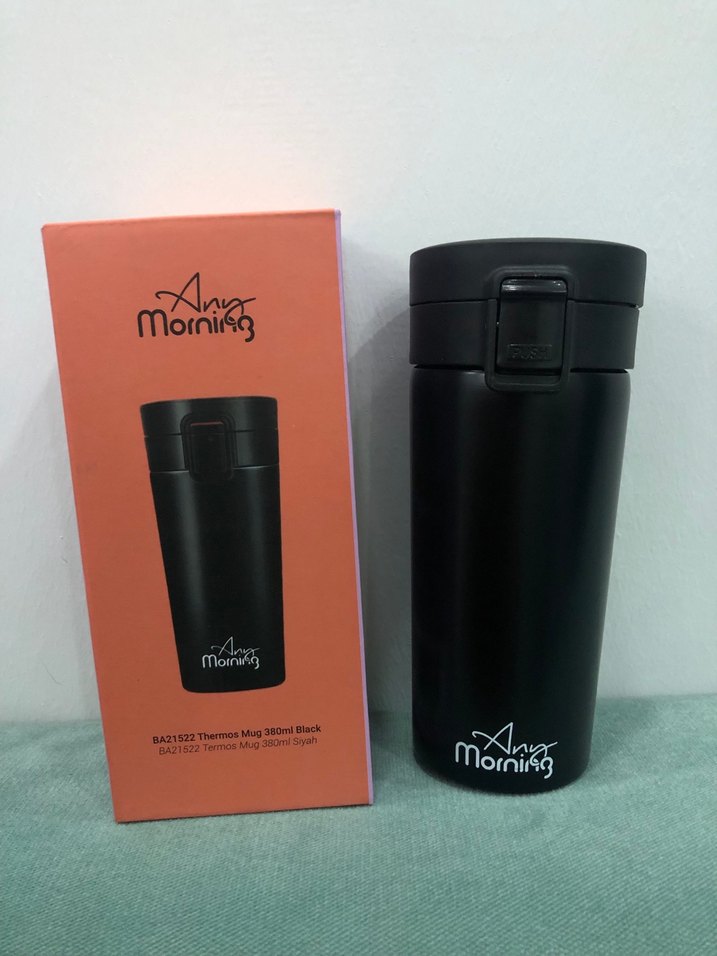Ürün sıfır, hiç kullanılmadı. Çift katmanlı, paslanmaz çeliktir. Sızdırmaz, kilitli, tuş mekanizmalı kapağa sahip, 380 ml’dir. İçinde çelik filtresi vardır.