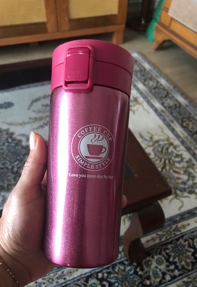 Canlı pembe renkte, kapaklı çocuk termos şişesi. Üzerinde 'Love you more day by day' yazılı kahve fincanı simgesi bulunur. Kolay taşınır. ☕