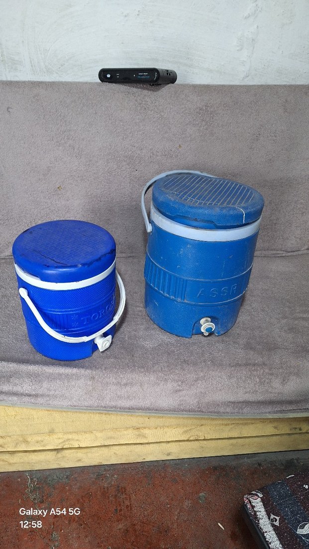 Kapasiteleri farklı iki mavi termos, taşıma kulplu ve kapağı kapalı. Sıvıları sıcak tutmak için musluklu tasarım. Çocuklar için uygun.