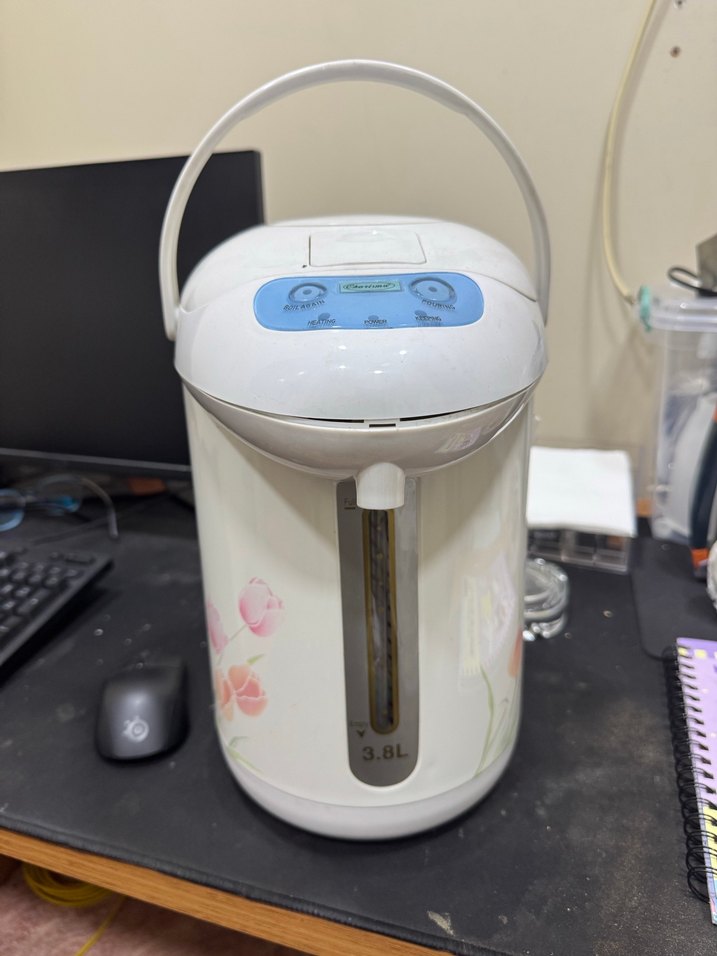 Pastel beyaz renkte, 3.8 litrelik su seviyesi göstergeli su ısıtma makinası. Üstte kontrol butonları ve taşıma sapı bulunur.