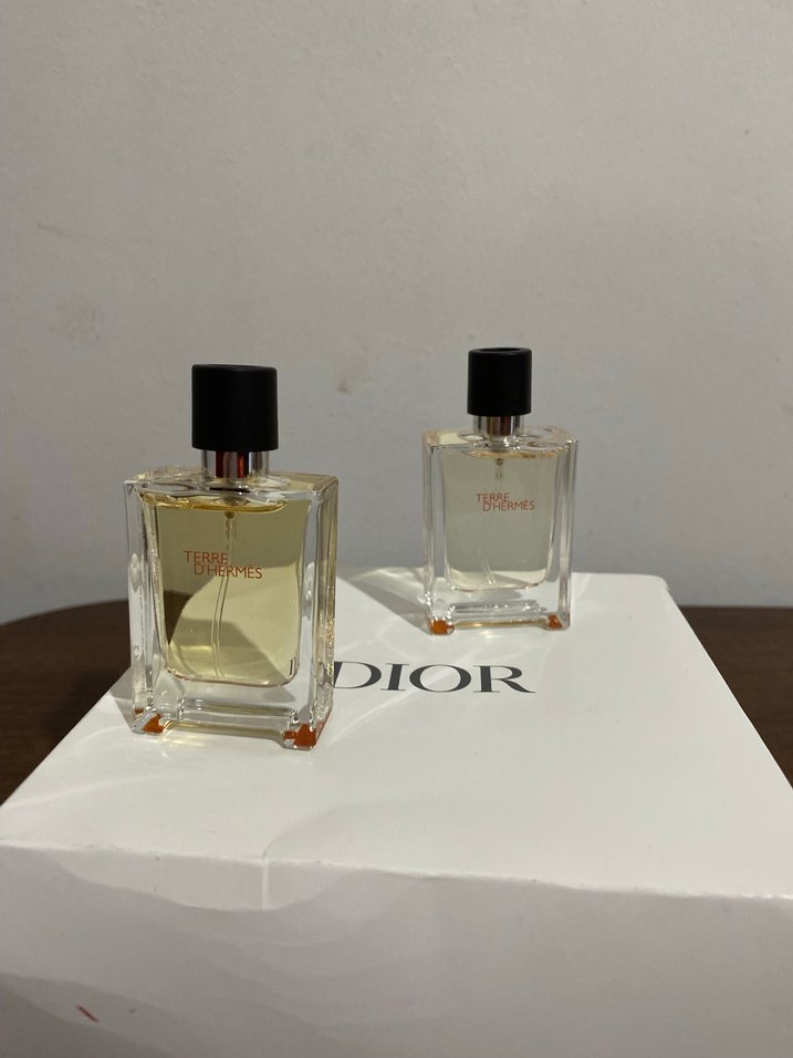 Terre d'Hermès erkek parfümleri, siyah kapaklı klasik dikdörtgen şişelerde, çağdaş koku ve bej-gri tonlarda sunuluyor.