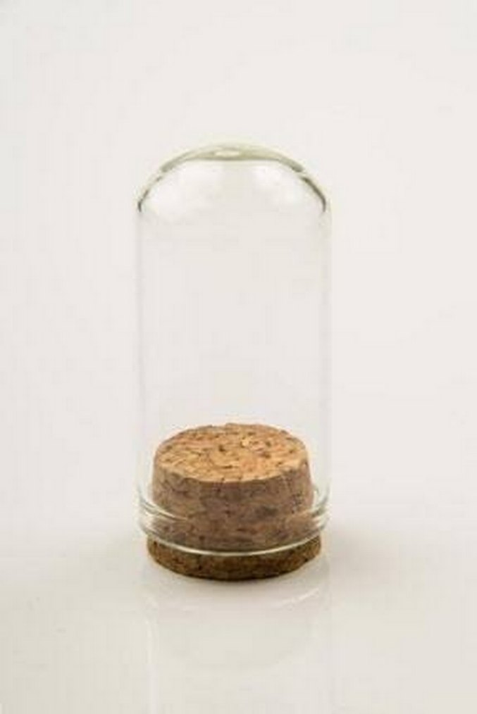 Şeffaf cam gövde ve bej mantar taban ile kapaktan oluşan basit ve doğal görünümlü vazo.