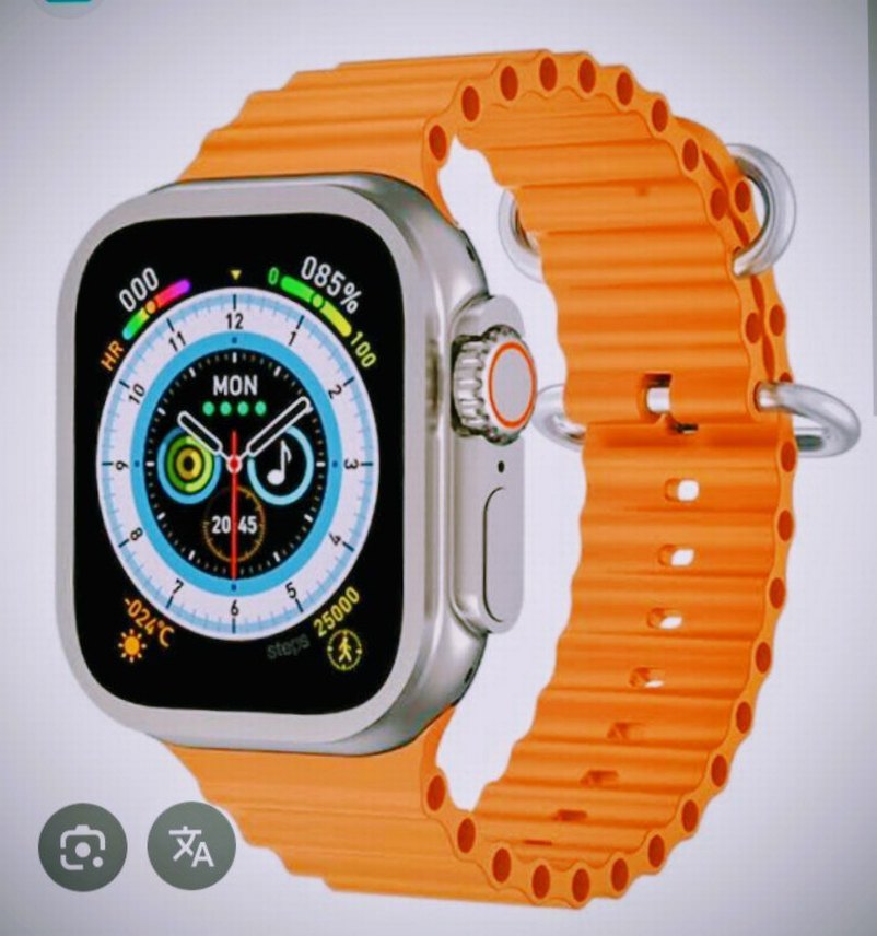Koyu renkli akıllı saat, çok renkli canlı ekrana sahip ve siyah ile parlak turuncu olmak üzere iki değiştirilebilir kayış içerir.