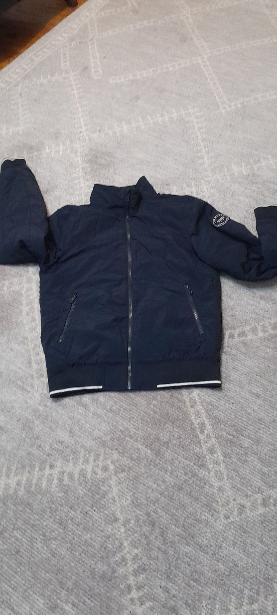 Erkekler için ince kesim, yüksek yakalı ve uzun kollu lacivert mont. Yumuşak ve sıcak kumaştan, fermuarlı cepler ve ön tam fermuar içerir. Birkaç kez kullanıldı.Mevsimlik mont