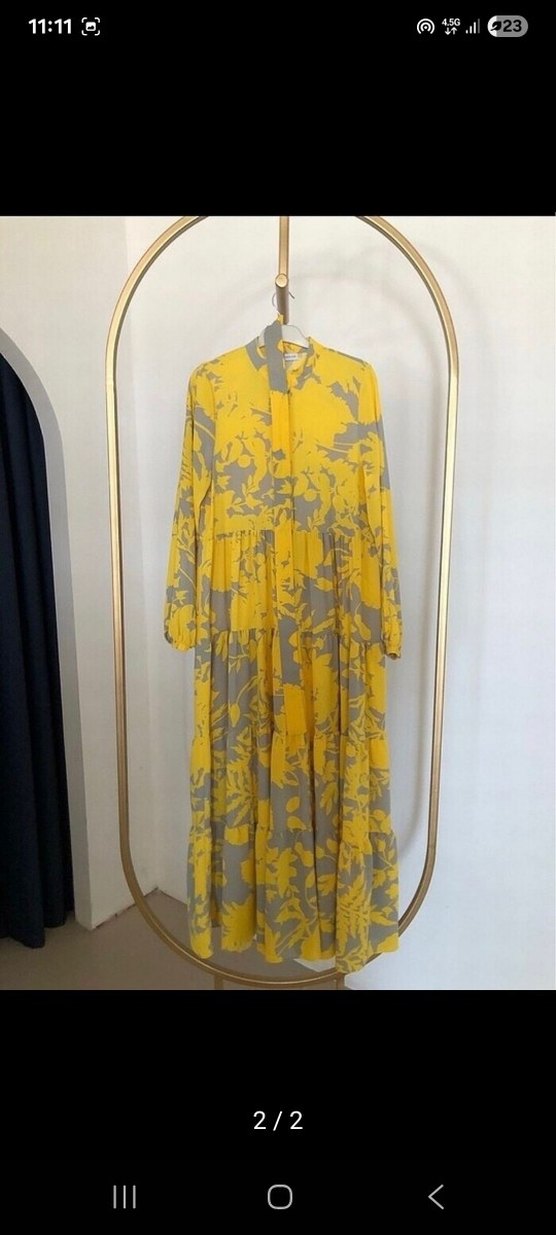 Uzun kollu, yüksek yakalı, bol kesim ve pilili tasarıma sahip sarı gri batik desenli, yumuşak sentetik kumaştan elbise. uygulamadan aldim beden uymadı