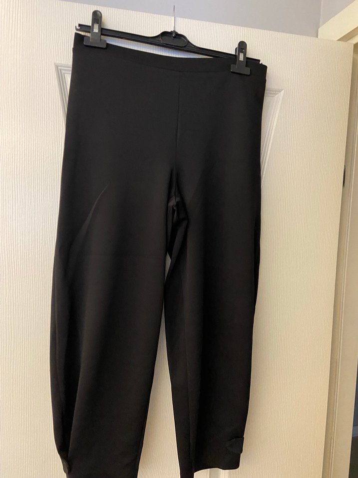 Siyah, salaş kesim ve midi boy kadın kumaş pantolon. Yumuşak ve parlak kumaştan, ofis için şık ve rahat bir tarz sunar.
